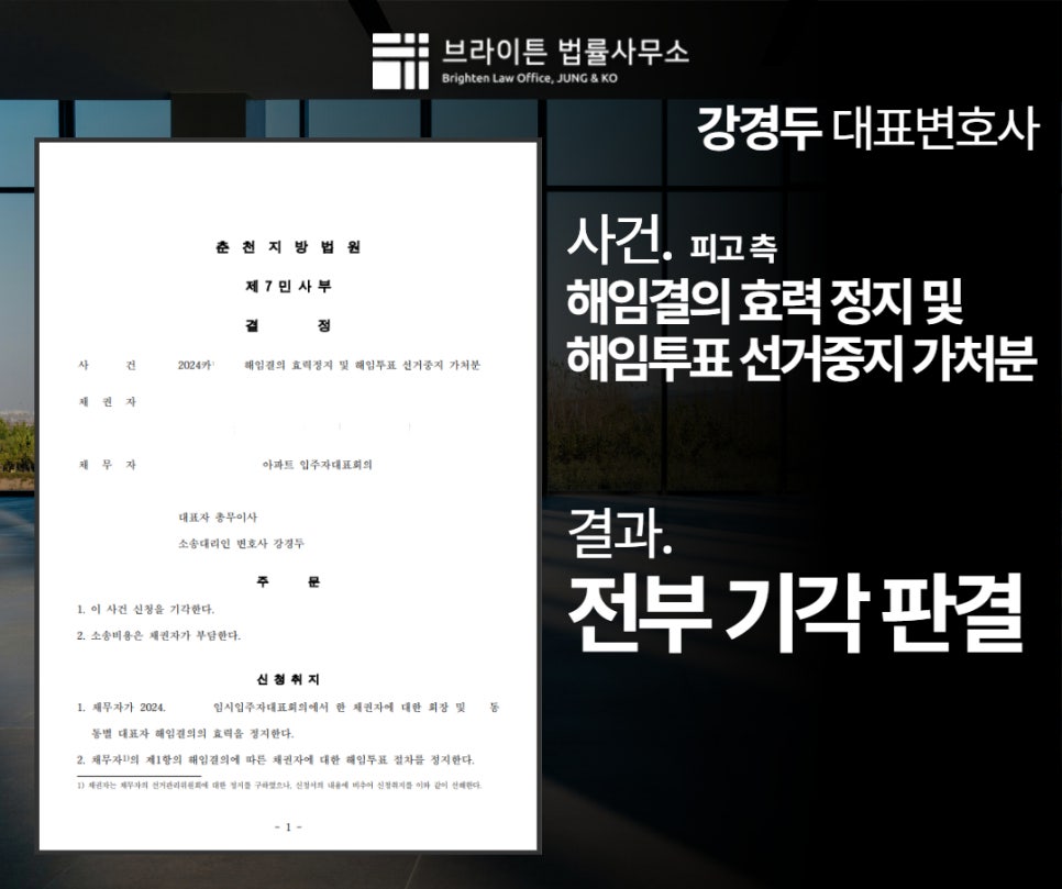 입주자대표회의, 해임결의 가처분 전부 기각시킨 해결사례 *의뢰인의 개인정보보호를 위해 각색되었음을