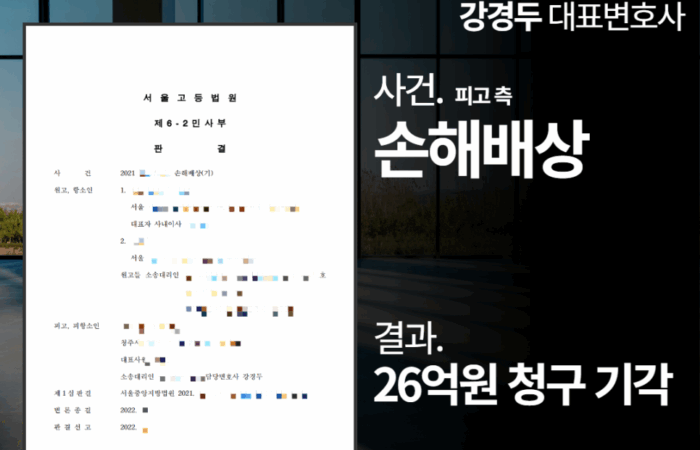 Author kdkangweb Published on: 2025-11-14 손해배상전문변호사, 26억원 전액 기각시킨 성공사례 손해배상전문변호사, 26억원 전액 기각시킨 해결사례 *의뢰인의 개인정보보호를 위해 각색되었음을 알려드립니다. << 사실관계 >> 의뢰인은 건설사를 운영하는 업체의 대표였으며,