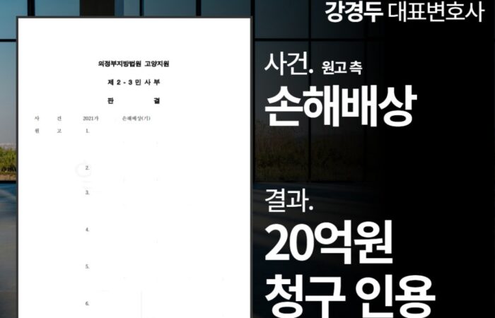 Author kdkangweb Published on: 2025-11-14 민사전문변호사, 손해배상 20억 원 인정받은 성공사례 민사전문변호사, 손해배상 20억 원 인정받은 해결사례 *의뢰인의 개인정보보호를 위해 각색되었음을 알려드립니다. << 사실관계 >> 의뢰인들은 당시 시행사에서 전체