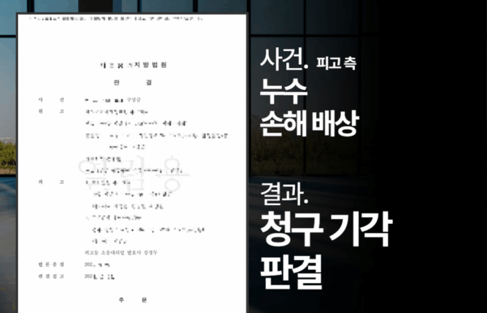 Author kdkangweb Published on: 2025-11-19 누수손해배상 변호사, ‘청구 기각’ 판결받은 성공사례 누수 손해배상 → 결과 : ‘청구 기각’ 판결 *의뢰인의 개인정보보호를 위해 각색되었음을 알려드립니다. << 사실 관계 >> 한