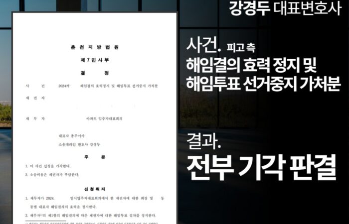 Author kdkangweb Published on: 2025-11-18 입주자대표회의, 해임결의 가처분 전부 기각시킨 성공사례 입주자대표회의, 해임결의 가처분 전부 기각시킨 해결사례 *의뢰인의 개인정보보호를 위해 각색되었음을 알려드립니다. << 사실관계 >> 당시 의뢰인들이 거주하고 있던