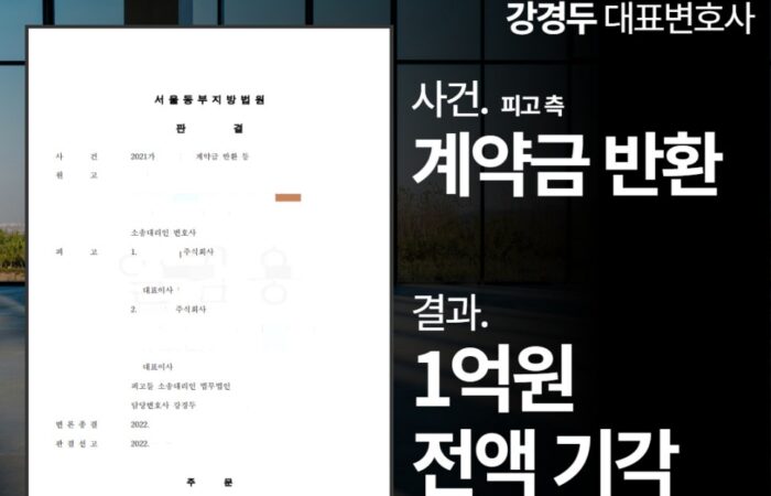 Author kdkangweb Published on: 2025-11-14 부동산전문변호사, 계약금 1억원 전액 기각시킨 성공사례 부동산전문변호사, 계약금 1억원 전액 기각시킨 해결사례 *의뢰인의 개인정보보호를 위해 각색되었음을 알려드립니다. << 사실관계 >> 의뢰인은 OO건설 업체의 대표였으며,